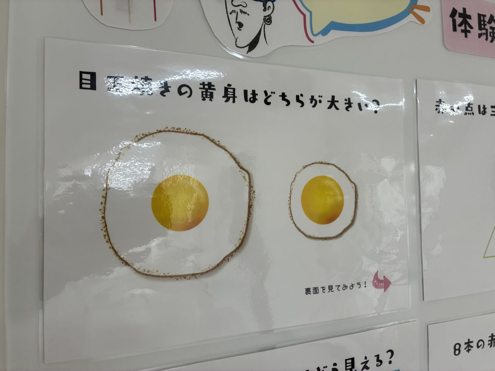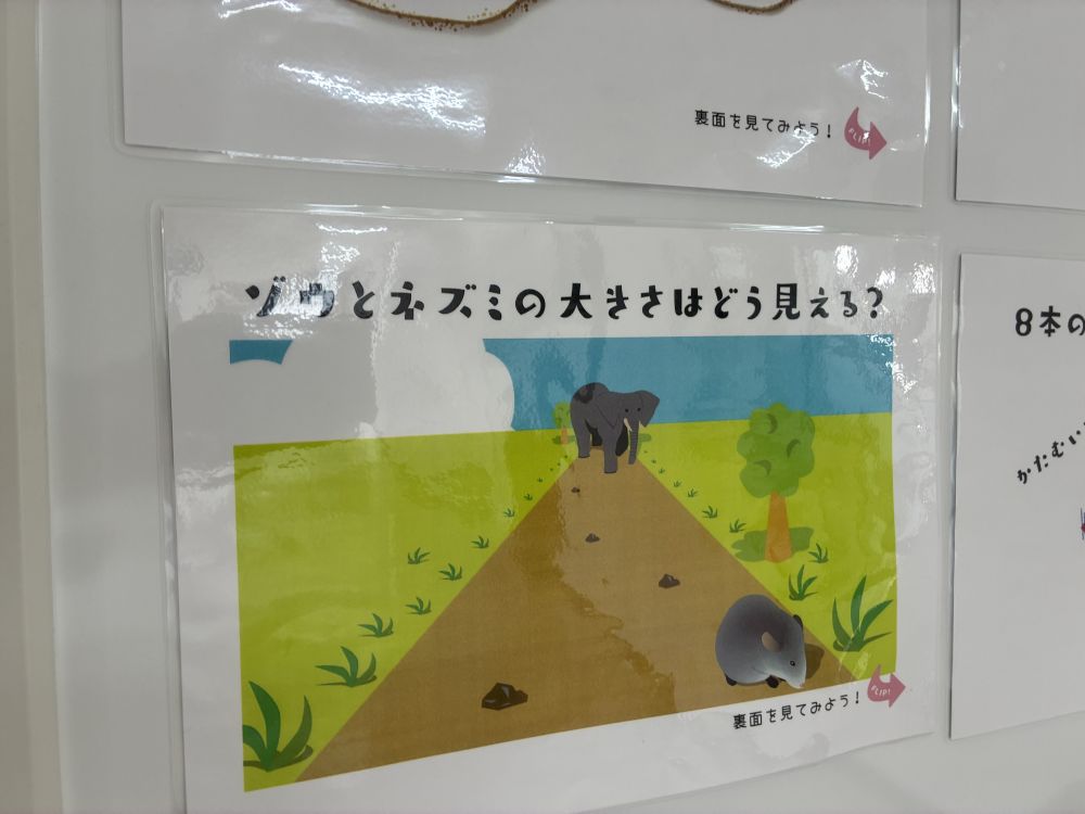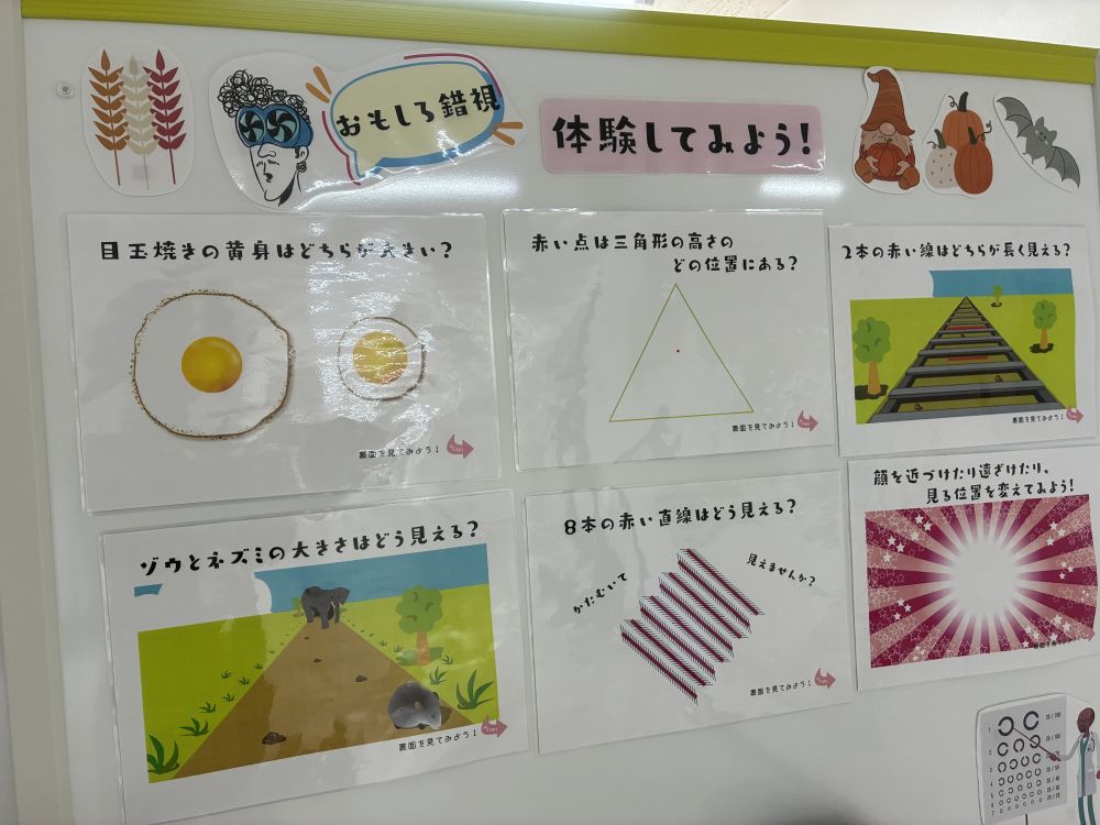 保健室前に「おもしろ錯視 体験してみよう」のコーナーが設けられています。「錯視」という言葉はなじみが薄いかもしれません。デザインの心理的効果を高めるために「錯視」を利用することもあるとのことです。「多義図形」をネット検索するとさまざまな錯視を経験することができます。このコーナーを設けた養護教諭の先生のねらいは何なのでしょうか?興味がわきます。