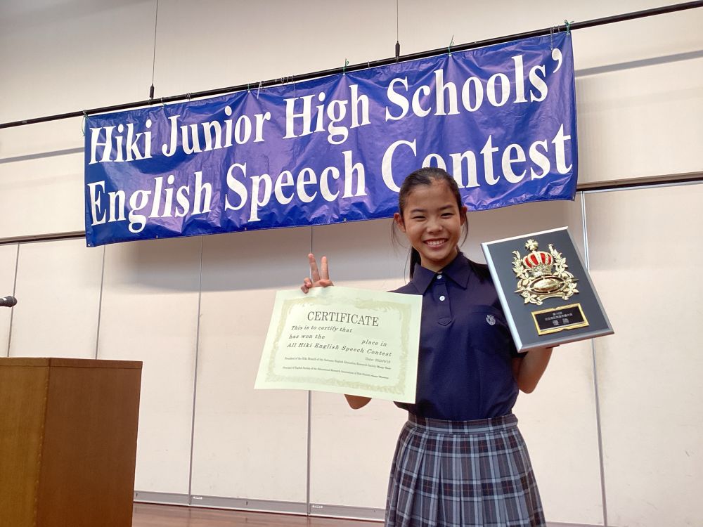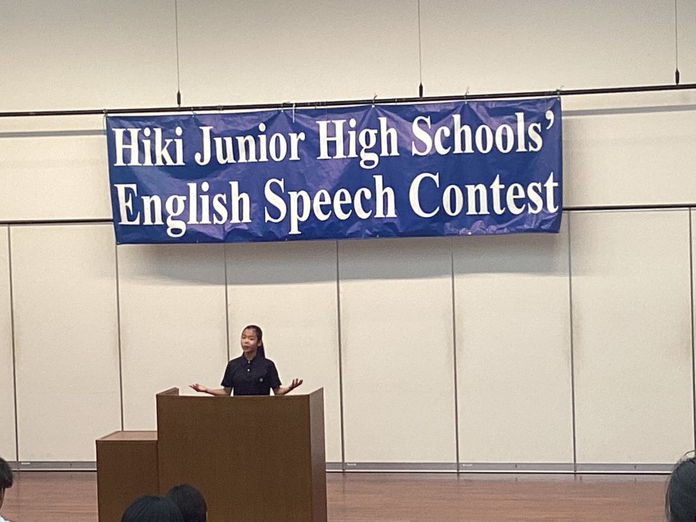 9月18日(木)、東松山市高坂市民活動センターにて「第72回比企地区英語弁論大会」が行われました。比企地区各中学校18校から各校代表が出場。本校から出場した中2女子の弁論のタイトルは「Experiencing Your Own Truth」。身振り手振りを交えながら、美しい英語を披露。背伸びもせず緊張感も感じさせず、ごくごく自然体で語る姿に感動しました。結果は優勝!10月に行われる県大会への出場を決めました。さらに上のステージを自然体で楽しんでほしいと思います。