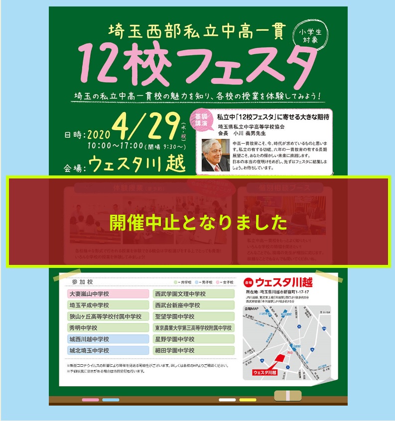 2020年4月29日(水・祝)に開催を予定しておりました「埼玉西部私立中高一貫12校フェスタ」は、新型コロナウイルス感染拡大防止のため開催を中止することが決定しました。