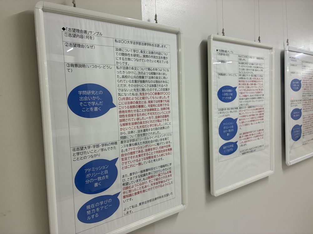 第2学期中間テスト、高校は3日目、中学は最終日となりました。そんな中、高校2年生の1号棟1階の大廊下には、大学の第一志望校届の案内と志望理由書に関する記入サンプルが掲示されています。高校2年生たちは8月の修学旅行、9月の浪漫祭を終え、いよいよ本格的に自分の進路について意識を高めていく時期となりました。一方で、高校3年生は中間テスト中とはいえ、個々の受験する入試形態に合わせて、受験の時期に突入しています。本日も日曜日の総合型選抜を受験する高3生2名が校長室を訪れて、面接対策や小論文の確認をしました。「合格しました!」の報告を楽しみにしています。