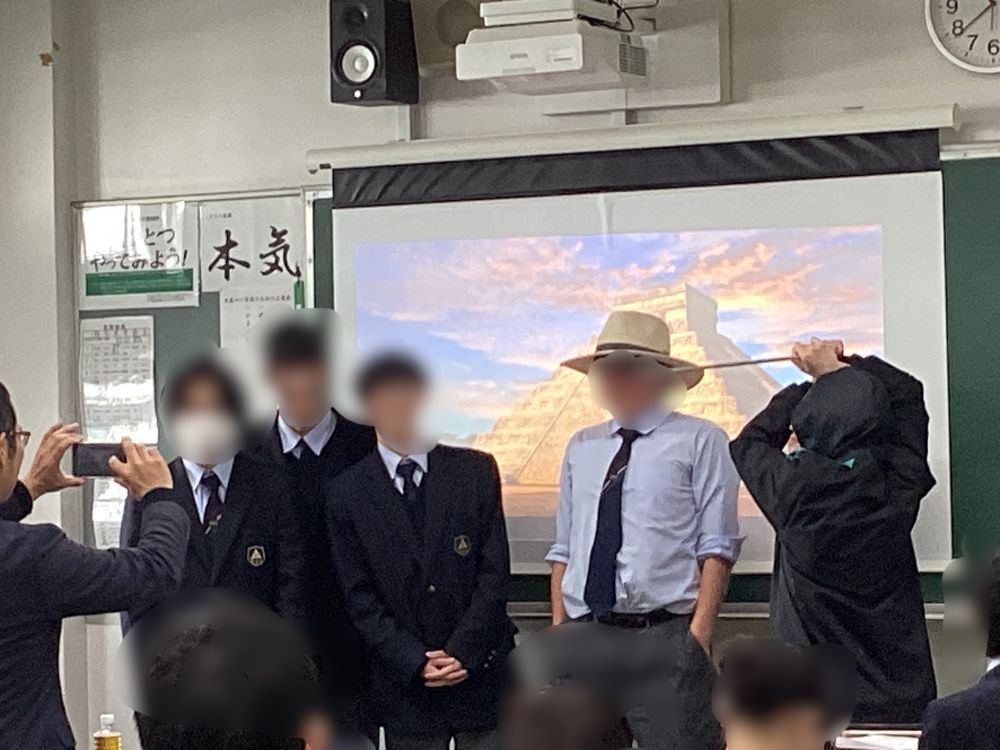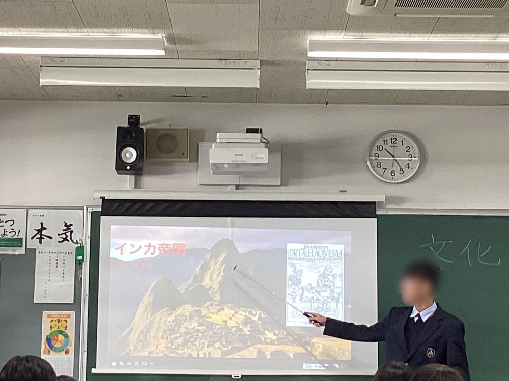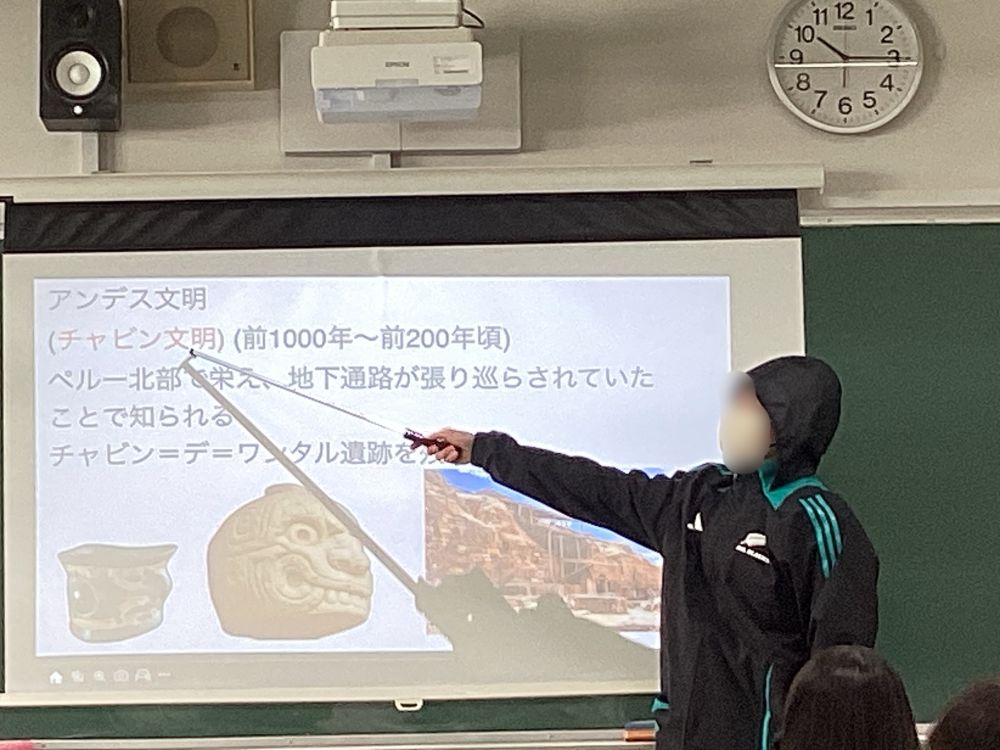 世界史担当の佐野先生から「生徒が授業をするので見に来てください」の誘いが...期待感満載で高校2年5組教室に出向くと、確かに生徒が授業を行っていました。一人10分前後で次々と教壇に現れます。内容は興味をそそるものばかり。衣装まで趣向を凝らす生徒もいて、あっという間に授業時間が終わりました。十分な準備ができていることを示す深堀したエピソード、テンポの良さ、手振り身振りを交えた計算しつくされた立ち居振る舞い、高校生たちの潜在的な力に驚くばかりでした。次の機会が楽しみです。