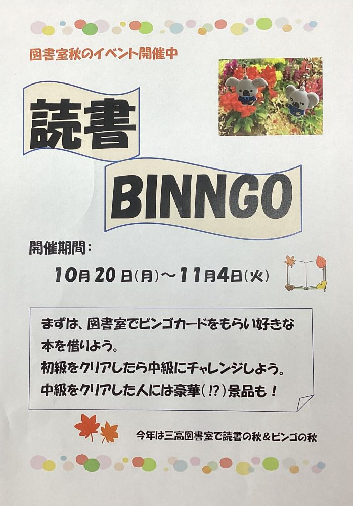 図書室秋のイベント「読書BINNGO」が開催されました。図書室から示された読書すべき様々なテーマ(本の分類)を<初級><中級><上級>という流れで読破していき、最後の上級をクリアした生徒はわずか1名。このほど、その1名を校長室で表彰。賞品の学校のグッズ等を手渡しました。図書の先生によれば、とても読書好きの生徒とのこと。「褒める」という視点で一人一人の生徒と関わっていきたいと考えておりますので、図書室運営に力を入れている本校としては、貴重な機会となりました。