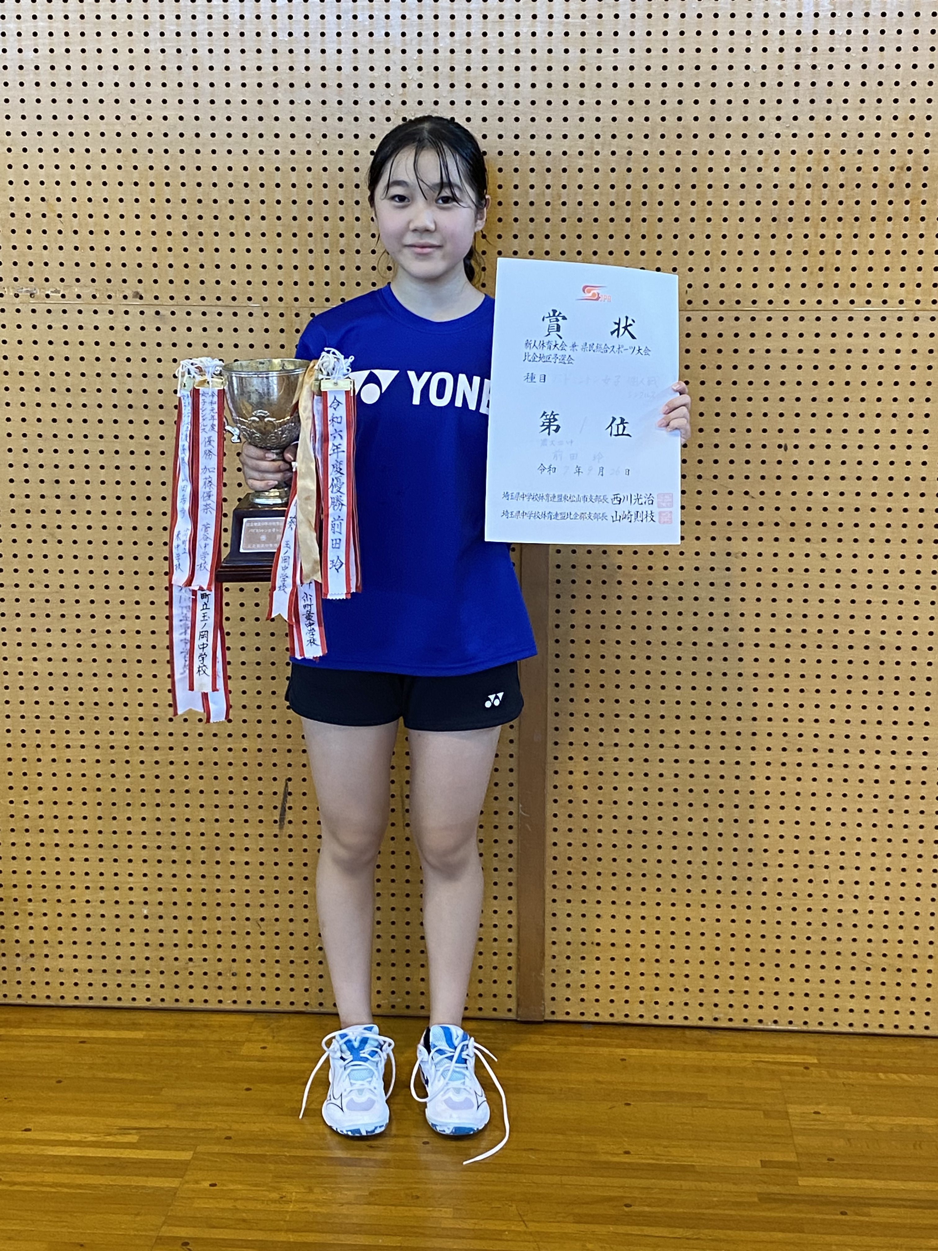 去る9月26日(金)ときがわ町せせらぎホールにて比企地区中学生バドミントン大会が行われ、本校2年1組の前田 玲さんが女子シングルスの部で優勝し、昨年に続き二連覇を達成しました。また、前田さんは埼玉県年齢別大会ベスト8の成績から、埼玉県中学校強化選手にも選出され、11月15日~16日に行われる強化練習会への参加も決まりました。